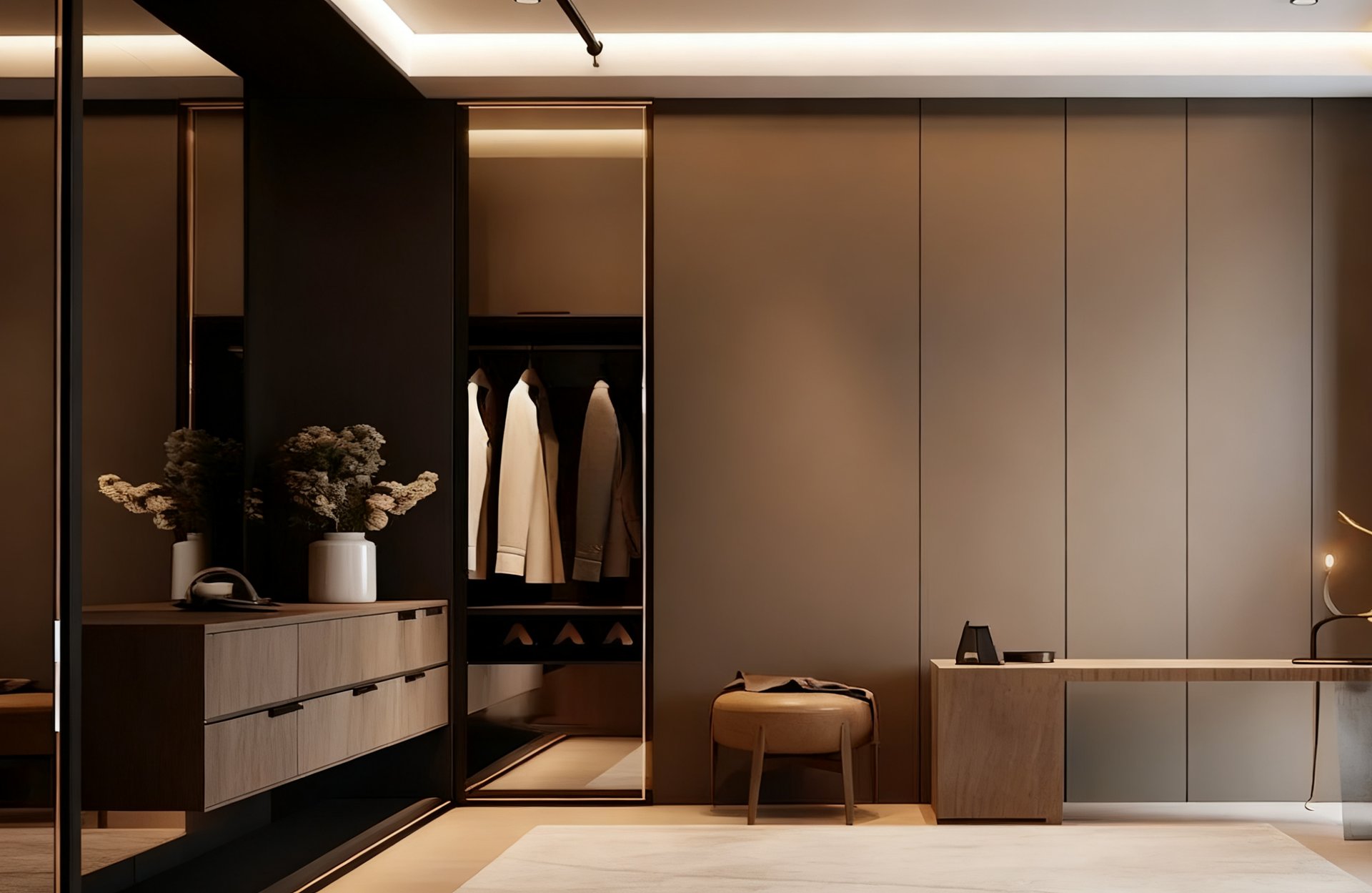 围绕 “材质统一、色彩统一、线条统一” 三个维度,让门、墙、柜从视觉上成为一个整体。例如用同色系木饰面覆盖墙面、制作柜门与房门,或用相同肌理的乳胶漆贯穿三者,同时通过隐藏式五金、无拉手设计弱化各部件的边界。